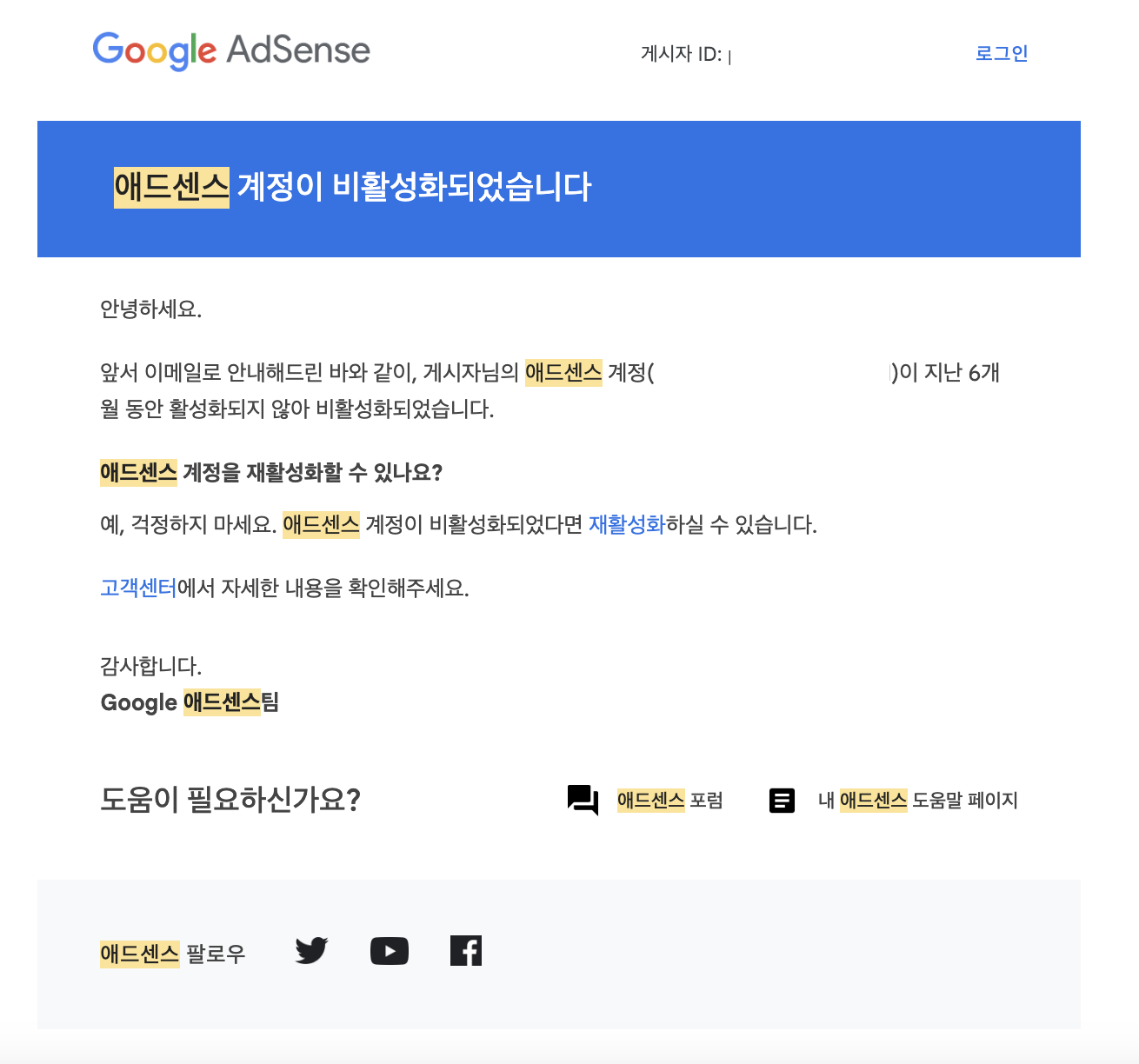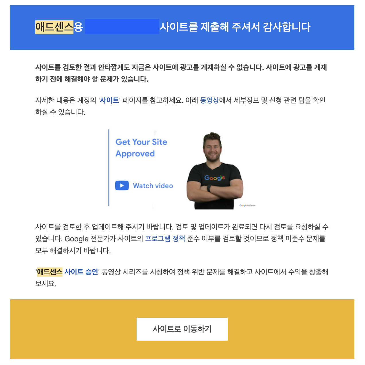 "사이트를 검토한 결과 안타갑게도 지금은 사이트에 광고를 게재하실 수 없습니다."