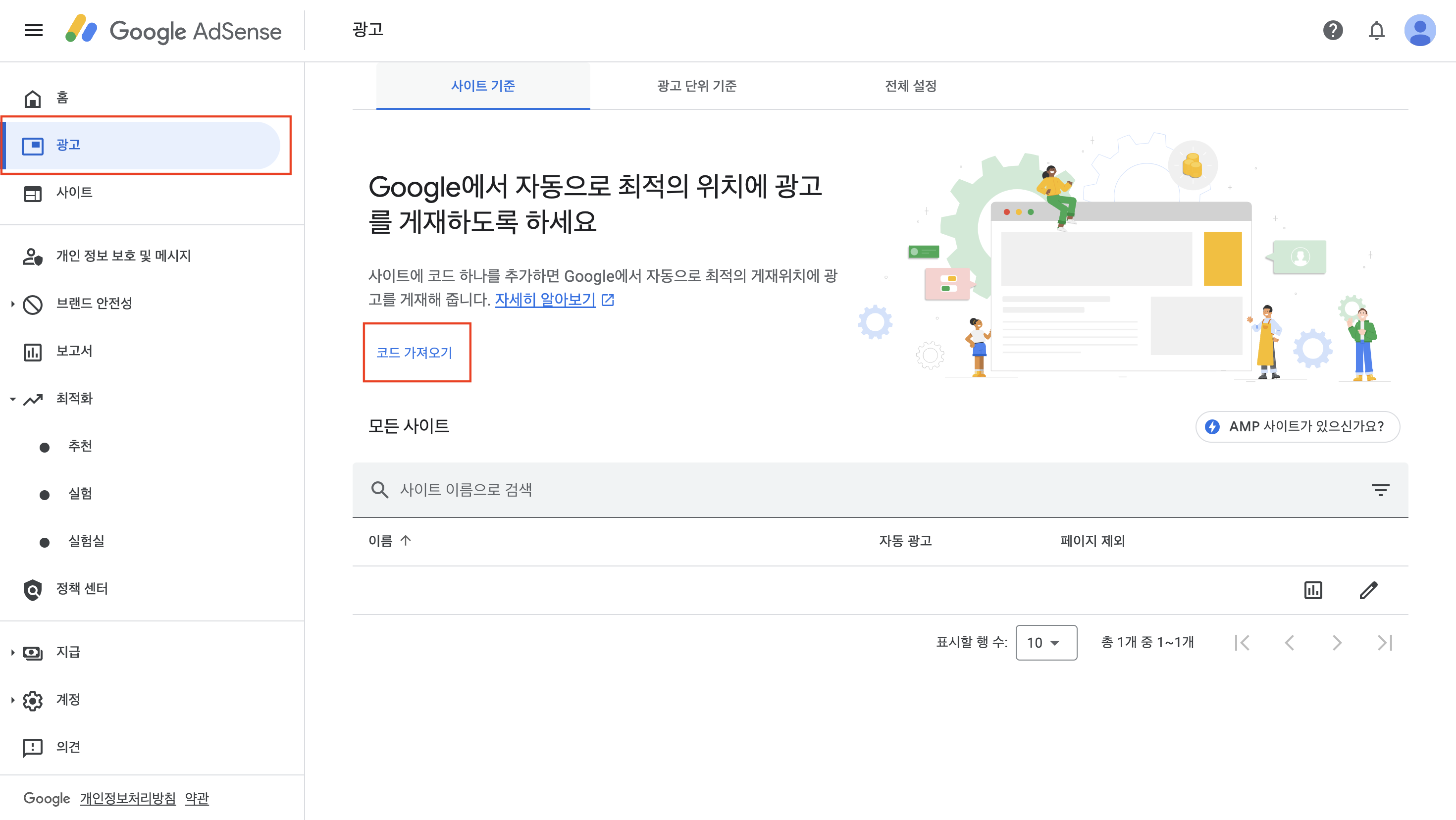 4️⃣ 구글 애드센스 접속 > 왼쪽 메뉴바에서 '광고'메뉴 > 오른쪽 편의 코드 가져오기를 클릭한다.