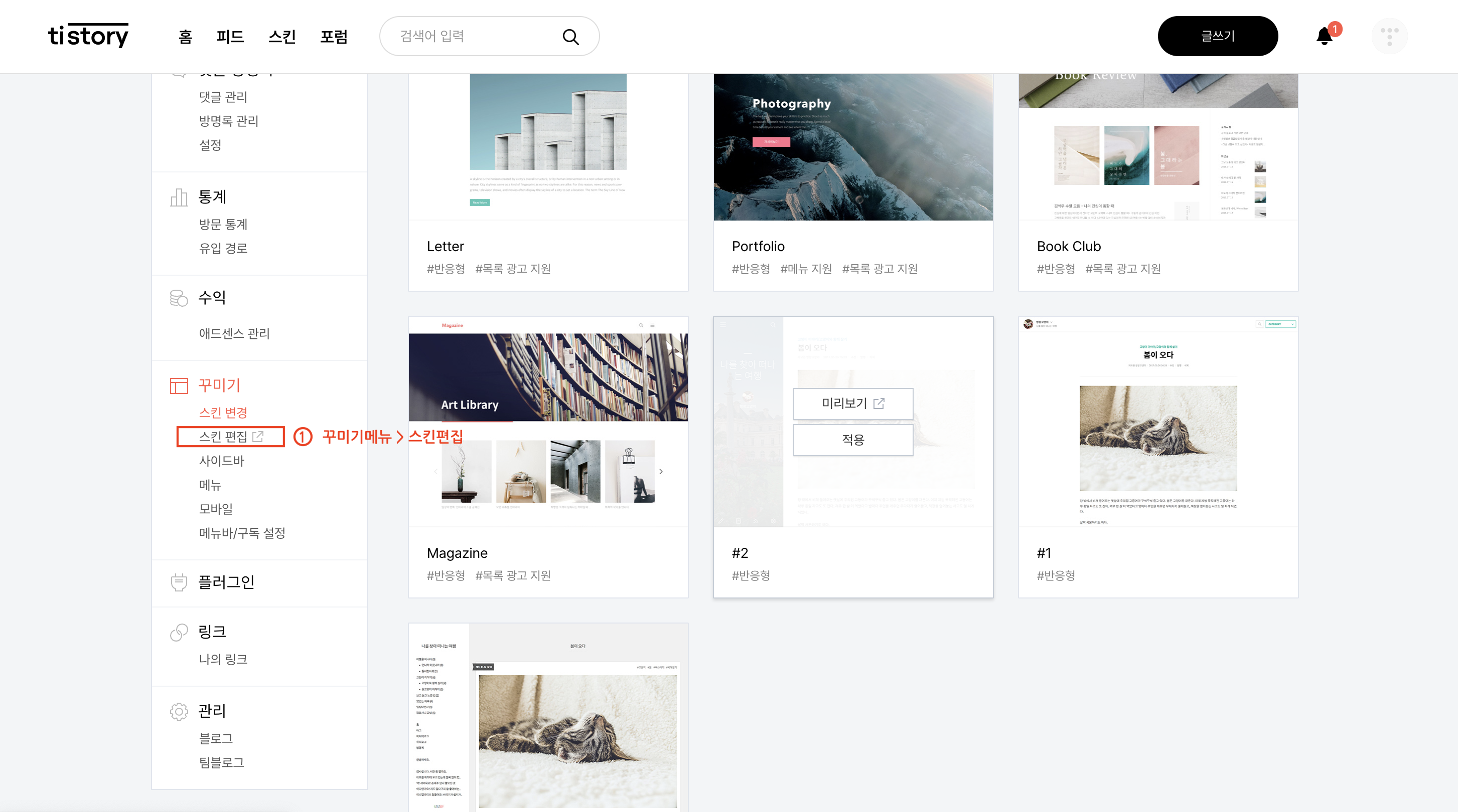 1️⃣티스토리의 블로그 관리 메뉴 > 꾸미기 메뉴 > 스킨편집 메뉴 클릭한다.