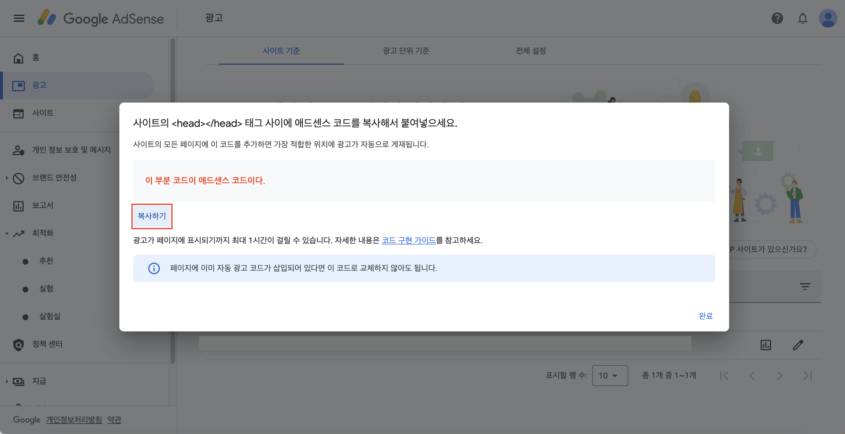 먼저 위 동영상에서 안되는 것을 체크해봤을 때 구글 애드센스 광고 코드 삽입이었다. 그래서 HTML광고 코드 삽입을 다시 체크해보았다.