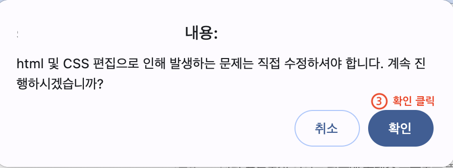 3️⃣html 및 CSS 편집으로 인해 발생하는 문제는 직접 수정하셔야 합니다. 계속 진행하시겠습니까? 라는 문구가 나오면 확인을 클릭