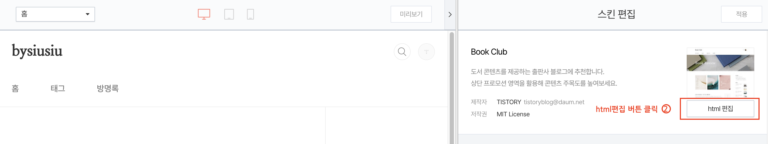 2️⃣오른쪽 메뉴의 스킨편집 섹션의 상단에 보면 > html 편집 클릭한다.