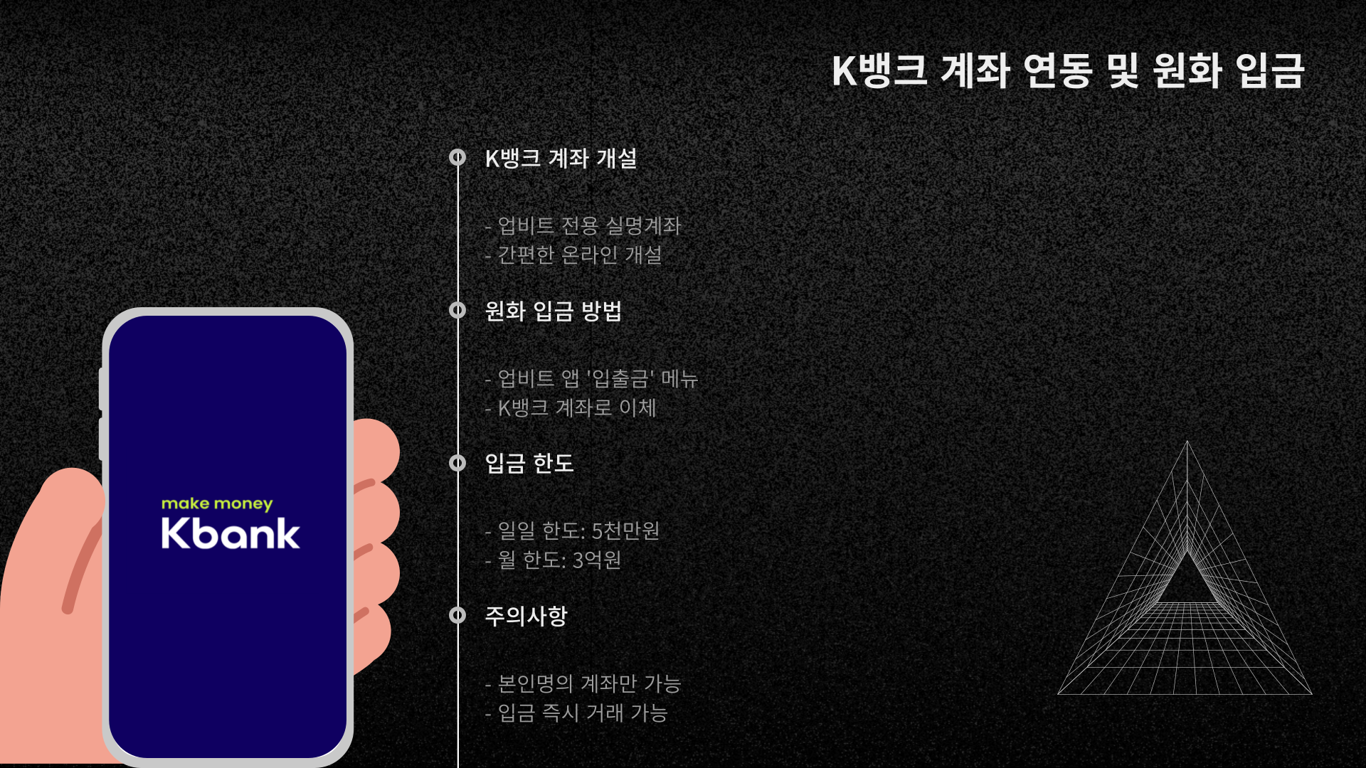 - 업비트는 K뱅크와 연동되어 있어 K뱅크 계좌 개설 필수.