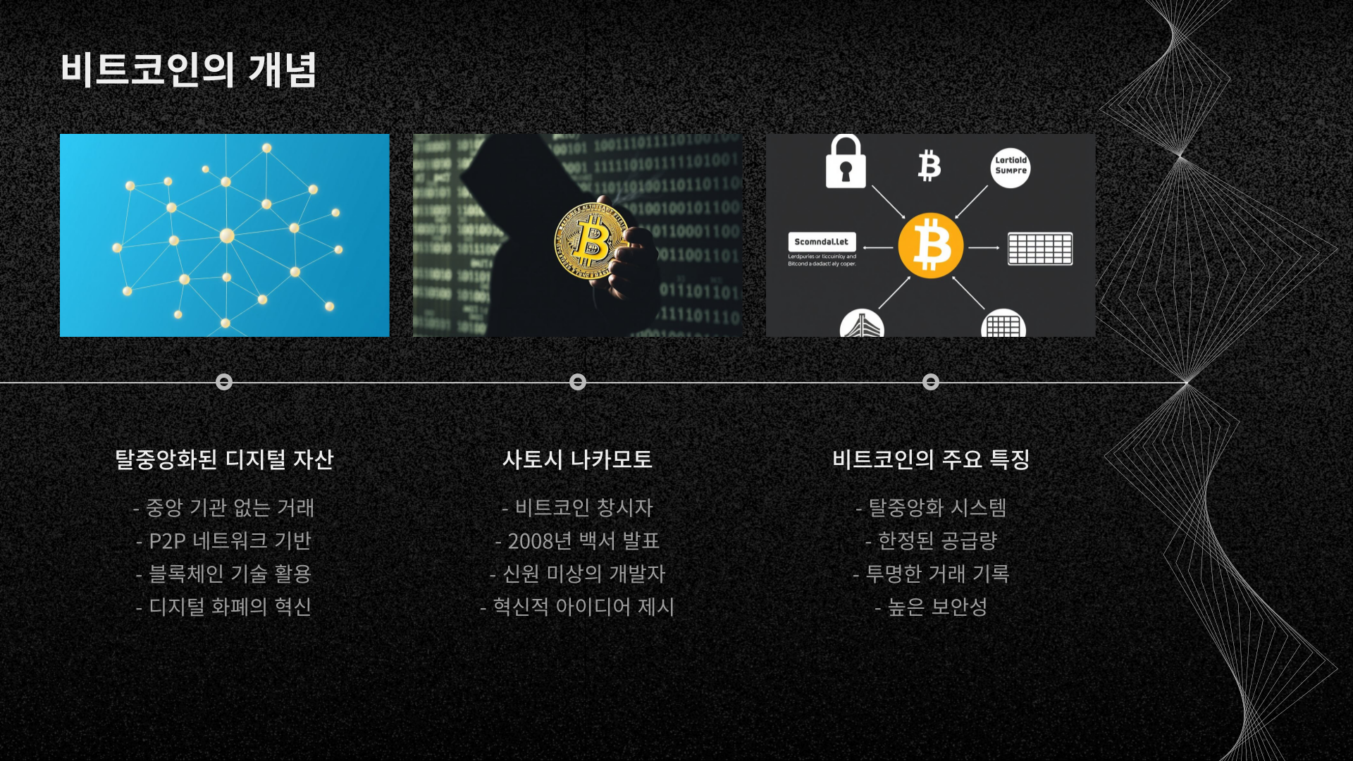 - 탈중앙화: 정부나 은행 같은 중앙 기관 없이 개인 간 거래 가능.