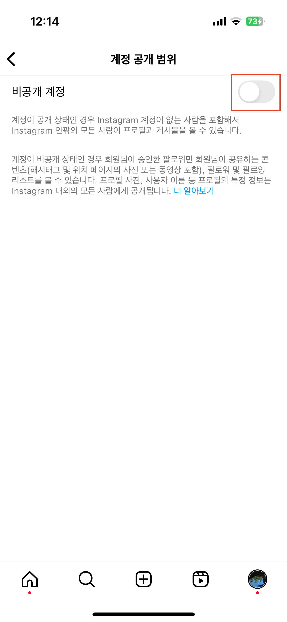 - 내 계정 → 설정 및 활동 → 계정 공개 범위 에서 비공개 계정이 비활성화 처리 되어야 한다.