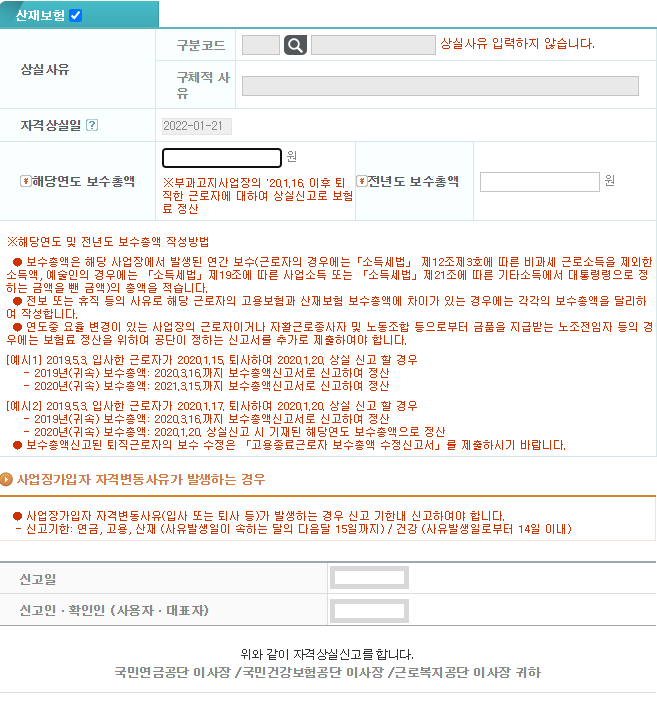 주의 할 점은 '4대보험상실신고'는 한번 접수가 되고 나면 수정이 어렵다. 수정을 원한다면 공단마다 다 각각 처리를 해야하기 때문에 이왕이면 한 번 신고할 때 꼼꼼하게 접수하는 것이 제일 좋다.