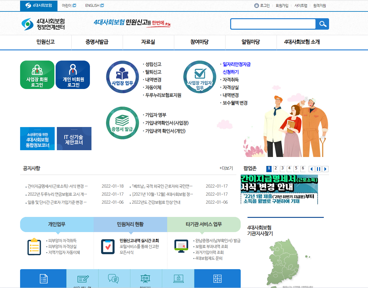 1) 위의 링크로 들어가면 메인화면이 보인다. 메인화면에 '사업장 회원 로그인'을 한다.