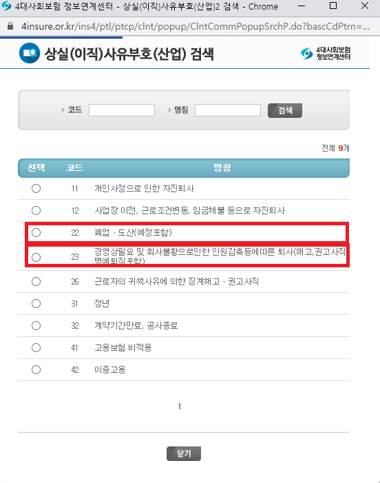 22,23번 코드를 입력하면 근로자가 '실업급여'를 신청할 수 있다. 26번의 경우 신청가능여부를 검토해야한다고 한다.