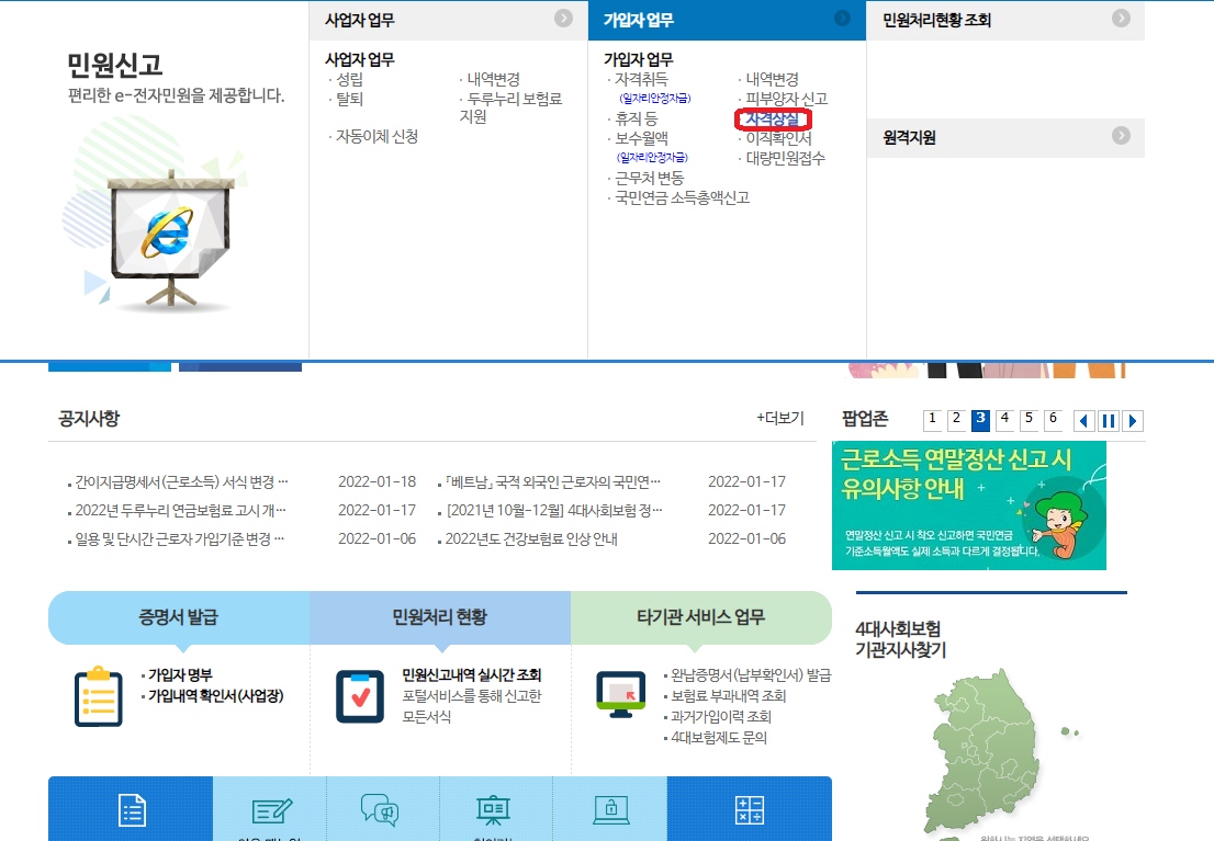 2) 반드시 사업장 회원 공동인증서 로그인을 해야한다. 아이디/비번으로 로그인 하는 경우 다시 취득/상실 신고시 다시 공인인증서 로그인을 해야한다.