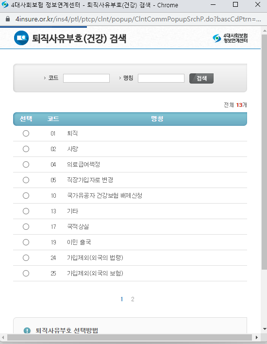 건강보험의 적절한 상실사유를 체크한다. 아마 사직서를 내고, 퇴직을 하는 경우 코드는 01 퇴직이 될 것이다.