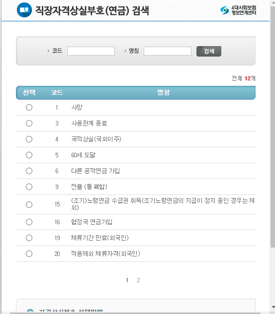 7) 국민연금부터 체크를 해서 상실사유를 입력하면 된다. 해당되는 사유를 체크하면 된다. 보통 두번째 '코드3 사용관계 종료'를 체크하면 될 것이다.