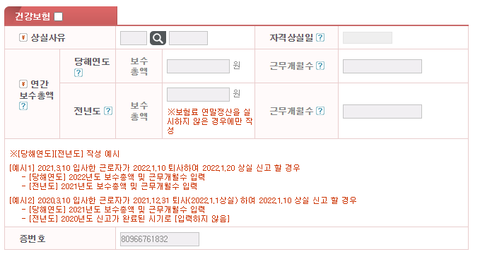 8) 건강보험도 체크하고 당해년도와 전년도 근무개월수와 보수총액을 입력해준다. 만일에 2021년에 07월 초에 입사하고 2021년 12월중순에 퇴사를 한다면 당해년도(2021년도) 보수 총액을 적어주고 전년도 보수총액(2020년도)는 0원이 될 것이다. 전년도 근무개월수는 1로 하면 된다.