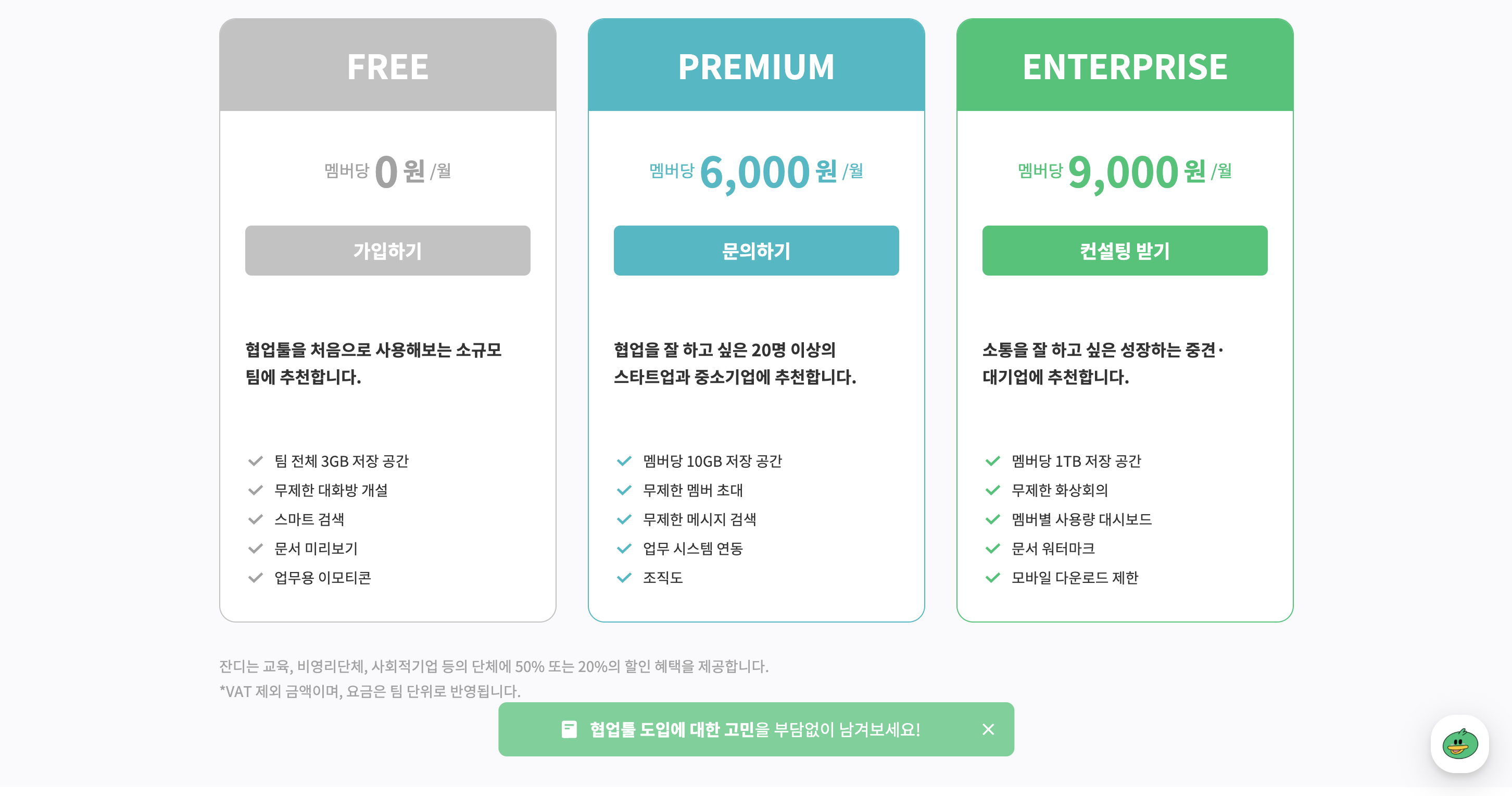 • 프리미엄 플랜: 사용자당 월 5,000원(20명 이상 팀 추천).
